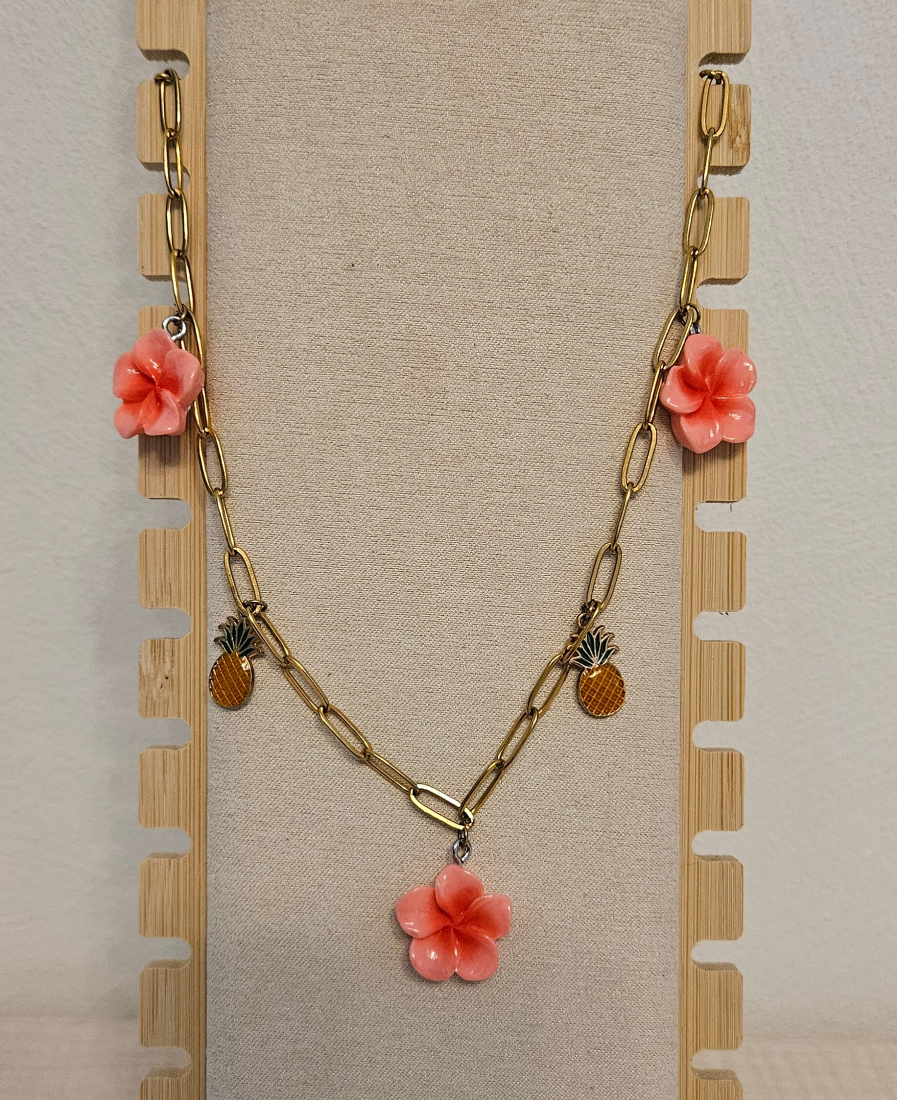 Ce collier est fait avec une chaîne inoxydable, breloques fleur et ananas.
