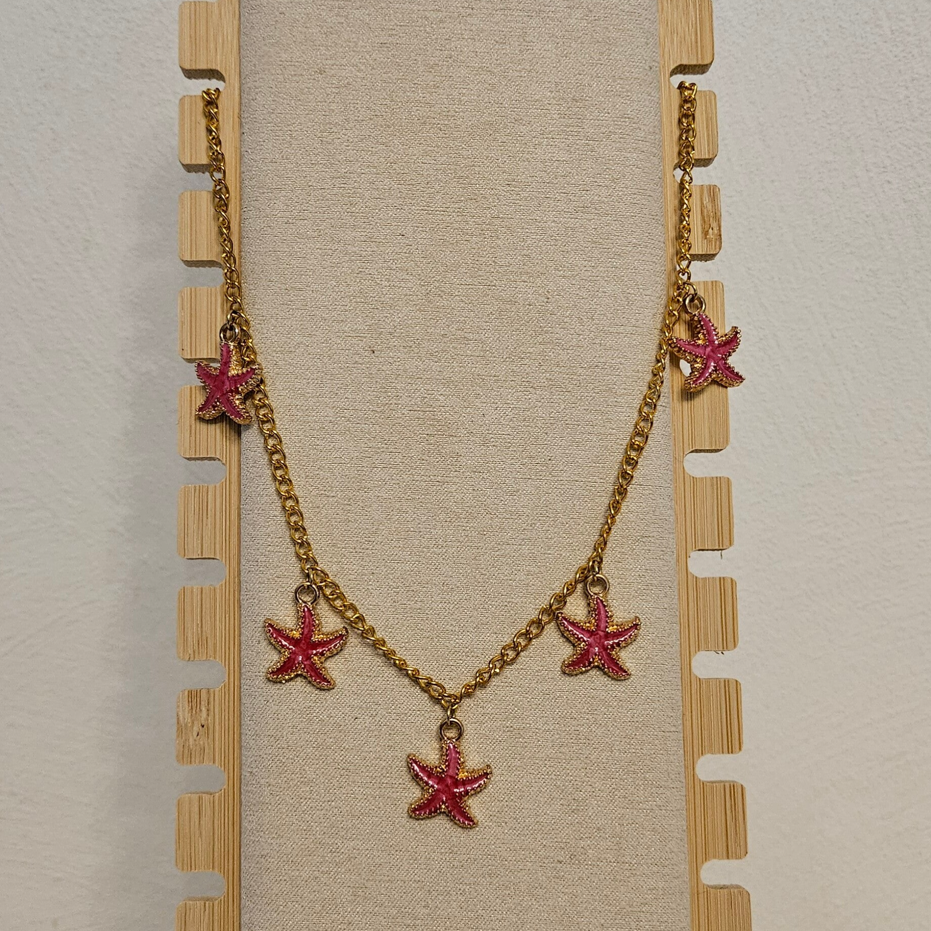 Ce collier est fait avec une fine chaîne en acier inoxydable et ses 5 breloques étoile de mer rose.