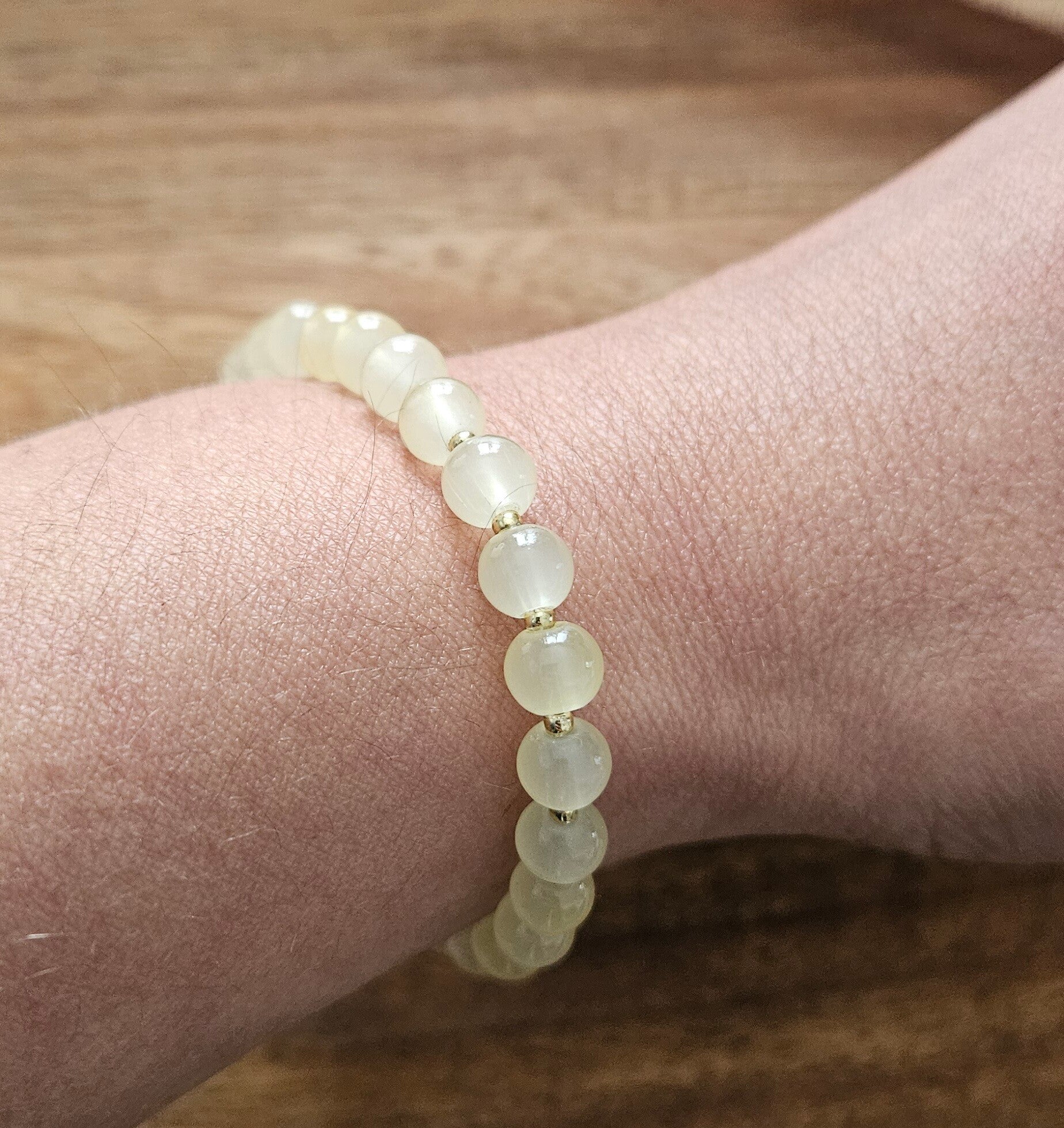 Bracelet en perles de verre 6mm coloris blanc nacré, doux et lumineux.