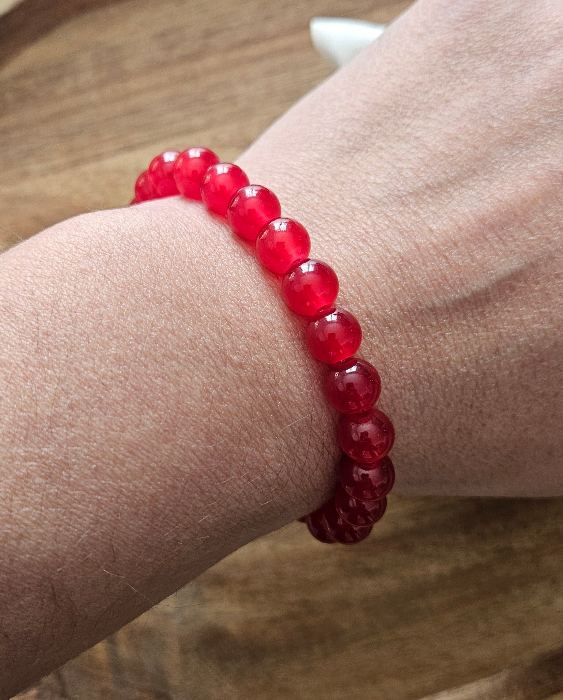 Bracelet en perles rouges 8mm, fait main avec soin.